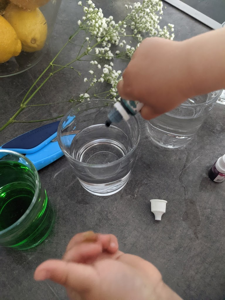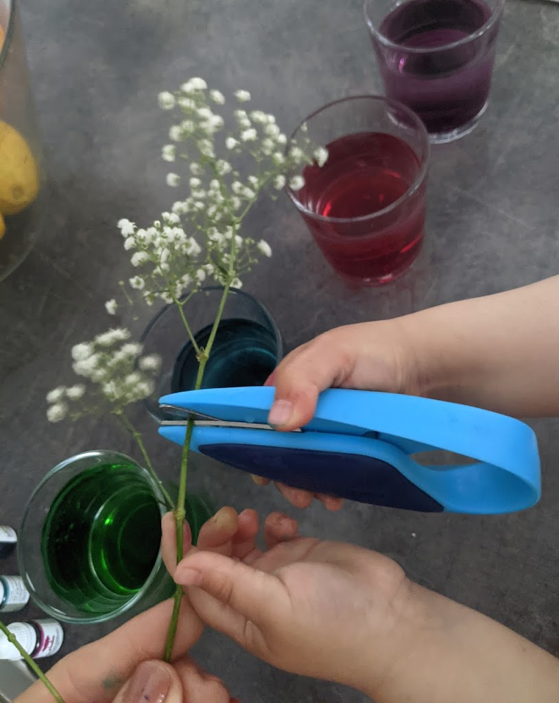 I set up everything (glasses, food colouring, pitcher, scissors, and flowers) and she just followed my simple instructions. She did everything independently, even the clean up after.